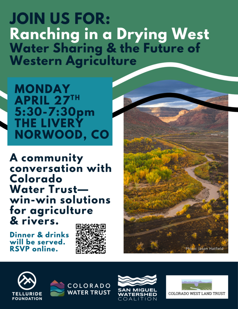 Join us in Norwood for a community conversation with Colorado Water Trust, San Miguel Watershed Coalition, Colorado West Land Trust, and Telluride Foundation on win-win solutions for agriculture & rivers.