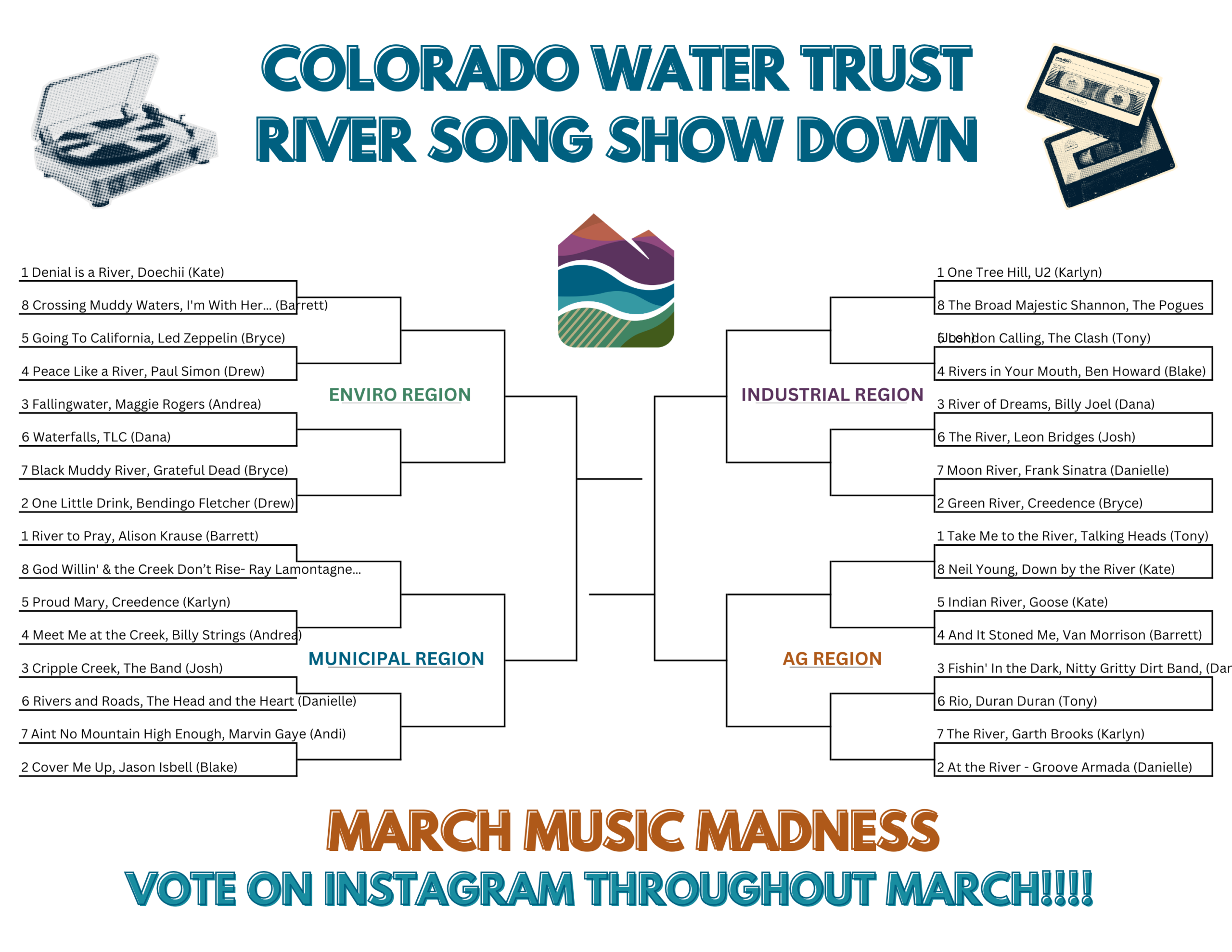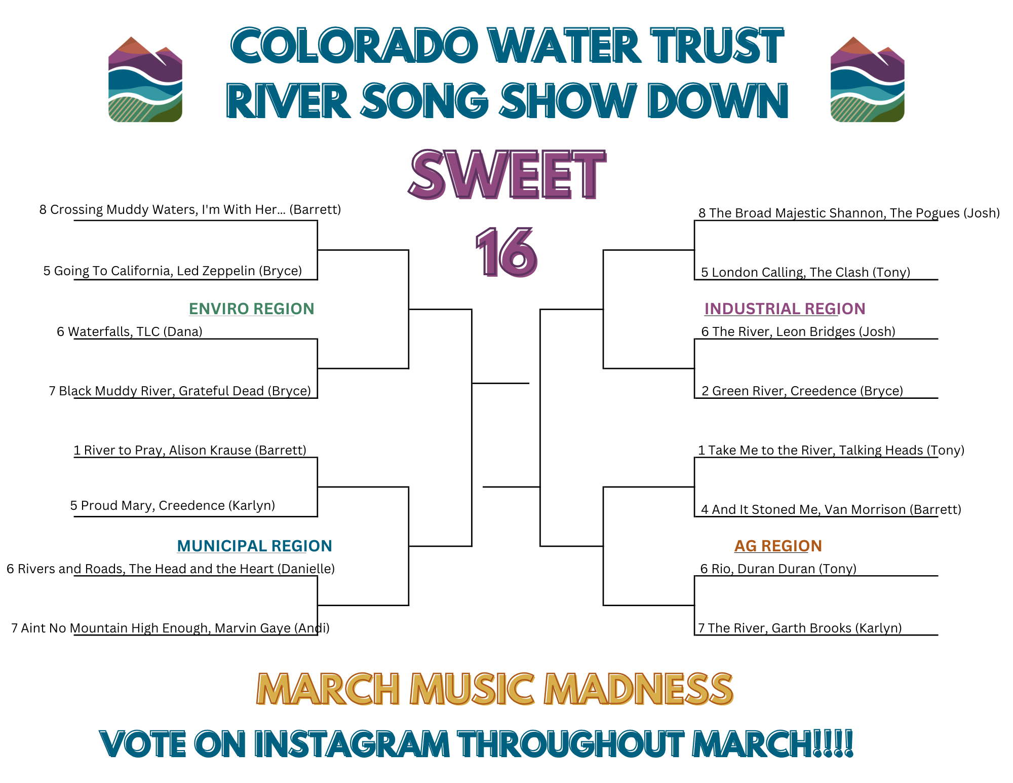 Just sharing a link to a playlist, however, seemed boring so we decided to share out each staff member’s top three songs and the reasons why they love them in this blog. We also wanted to get into the March Madness spirit and have a head-to-head tournament to determine the BEST RIVER SONG EVER! So, join us on Instagram for the fun.